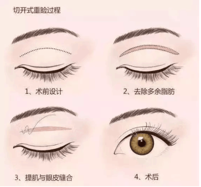 适用于任何类型的单眼皮,对上睑皮肤松弛和上睑臃肿者,切开法更为适宜。是一种永久性的重睑术,它是通过切口,去除松弛的皮肤、眼轮匝肌及肥厚的脂肪,在直视下直接皮肤同眼轮匝肌或提上睑肌腱膜缝合到一起,形成重睑。